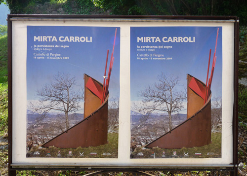 LA PERSISTENZA DEL SEGNO Mostra di Mirta Carroli a Castel Pergine S’inaugurava il 18 aprile 2009, nello straordinario scenario di Castel Pergine, maniero superbo che ospita un albergo e un ristorante, gestiti da Theo Schneider e Verena Neff, con ampia vista su una valle bellissima cinta da un anfiteatro di monti amati da artisti del passato come Tullio Garbari e Gino Pancheri, la mostra La persistenza del segno della scultrice emiliana Mirta Carroli, che rimarrà aperta sino al 8 novembre prossimo. Un’artista con un ampio curricolo di mostre fatte in Italia e all’estero, la partecipazione alla XLVI Biennale d’arte di Venezia per la grafica e la docenza di Didattica dell’arte all’Accademia di Belle Arti di Bologna.