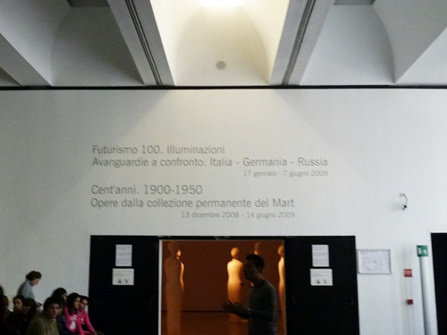 Futurismo 100 – Illuminazioni. Avanguardie a confronto: Italia – Germania – Russia A cento anni dalla nascita del futurismo, nell’ambito delle mostre allestite per celebrare il Manifesto futurista pubblicato a Parigi nel 1909 su Le Figaro da Filippo Tommaso Marinetti, il 13 dicembre 2008, il Mart inaugurava una grande mostra a cura di Ester Coen, con durata fino a metà giugno 2009, in cui erano messe a confronto le Avanguardie d’Italia, Germania e Russia.